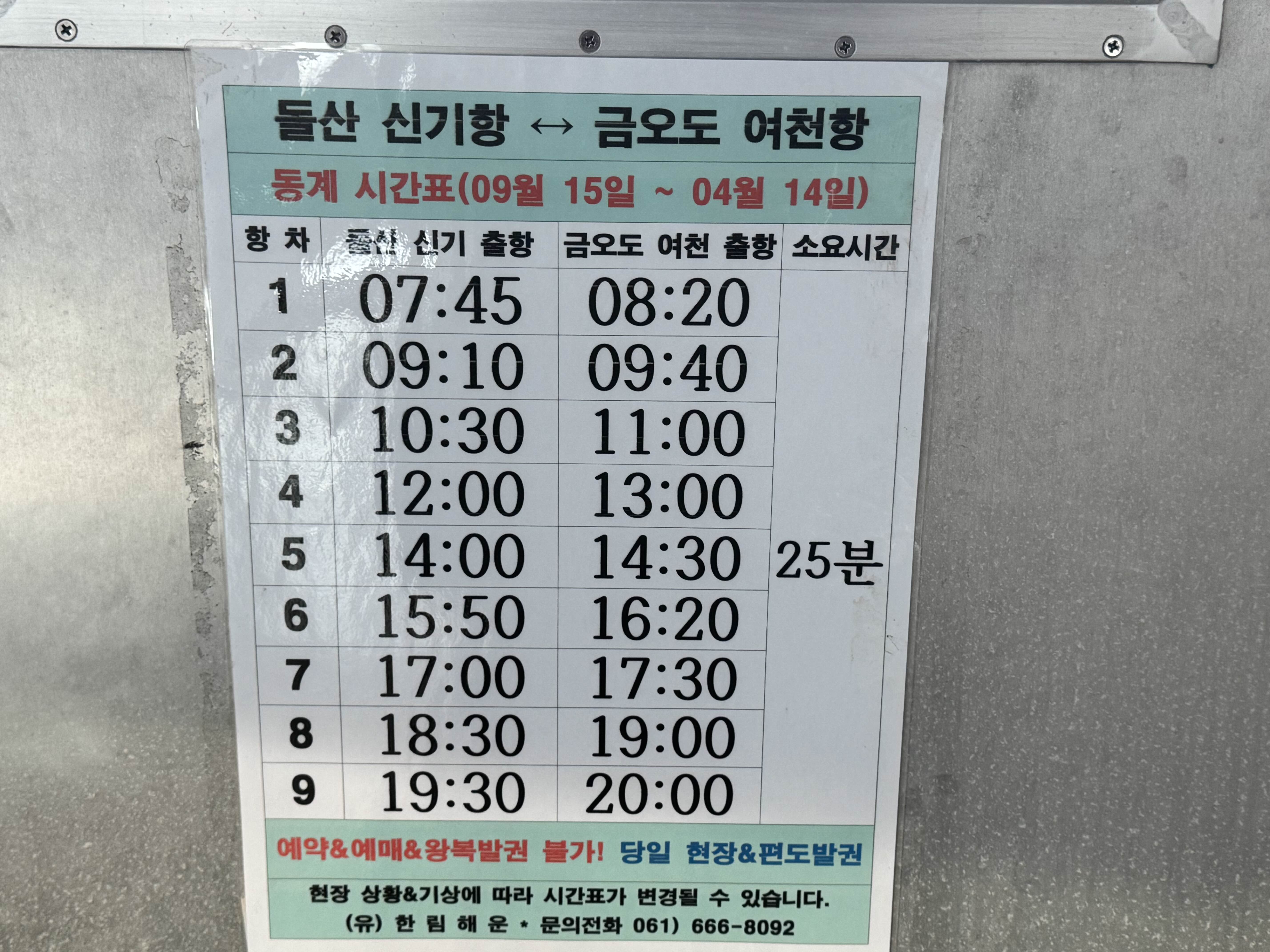 돌산 신기항에서 금오도 여천항을 오가는 여객선 시간표입니다. 7시 45분 것을 탔는데 승선시간은 25분 입니다.