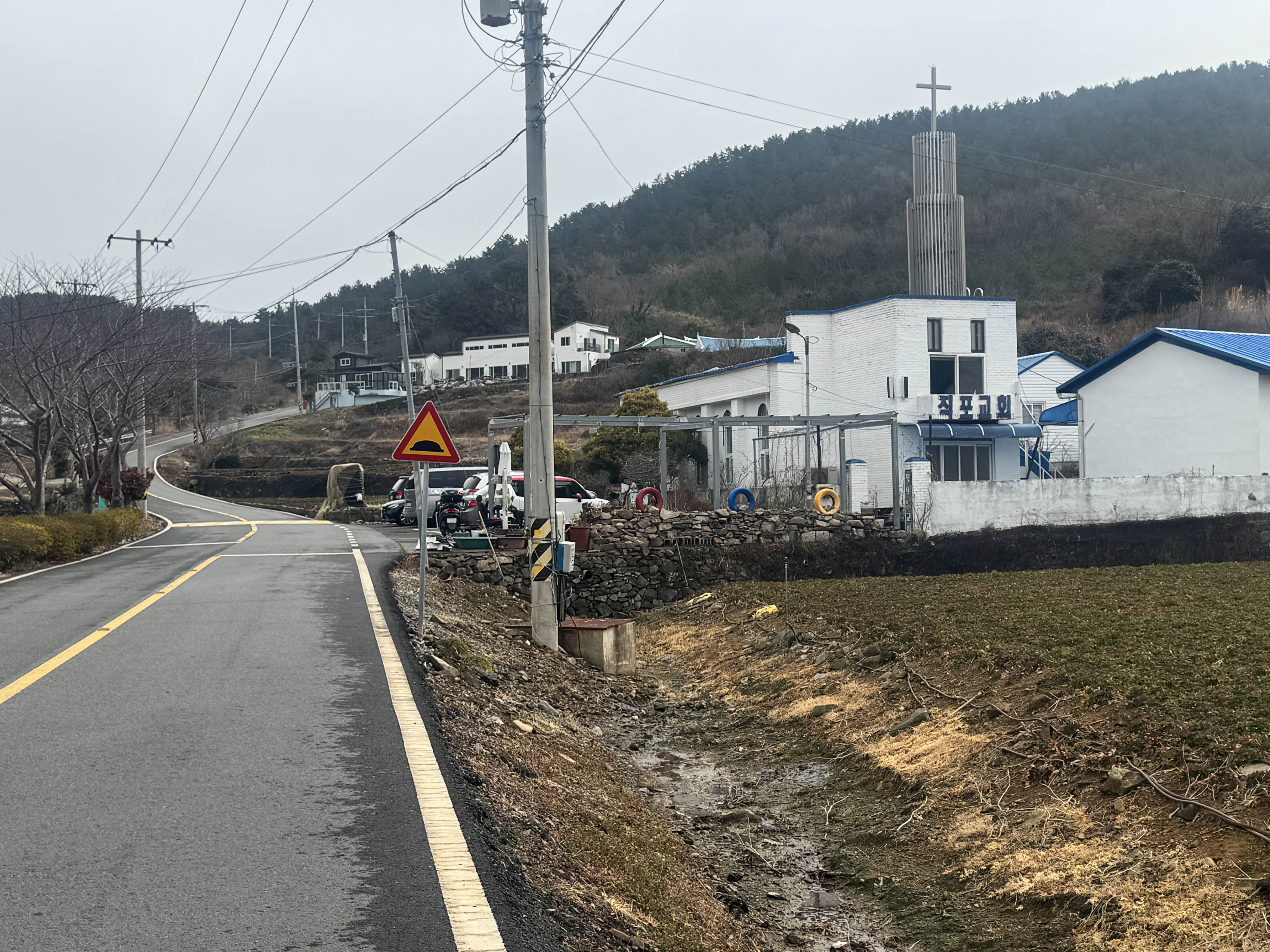 학동 마을 입구 도로 갓길에 차들을 주차해놓고