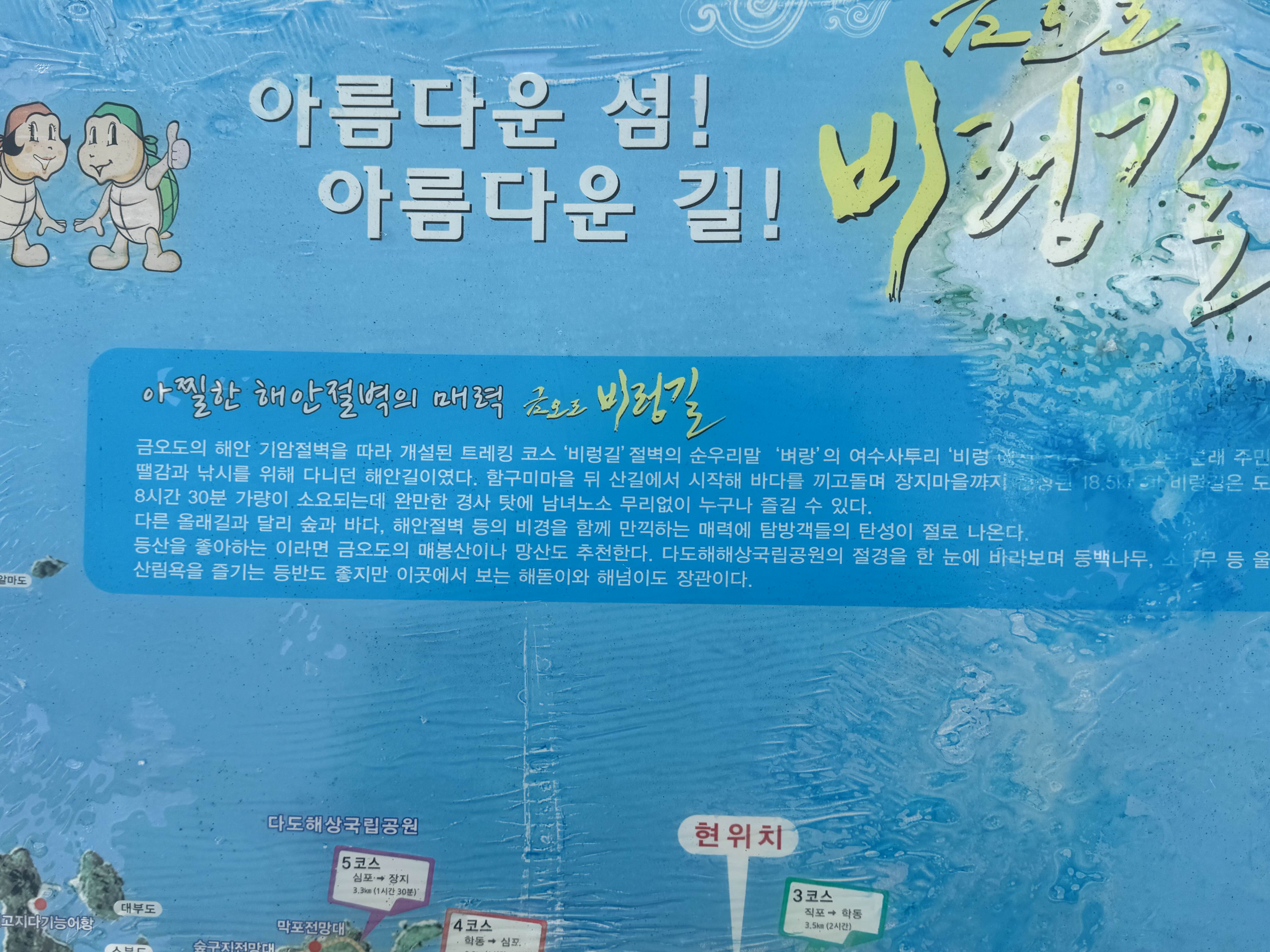비렁길은 5코스까지 있는데 그중 3코스를 다녀왔어요. 여수시 돌산읍에서 1박하고 아침 첫 배를 타고 금오도에 들어갔습니다. 학동에서 직포 방면으로 가는 비렁길 3코스를 선택했습니다.